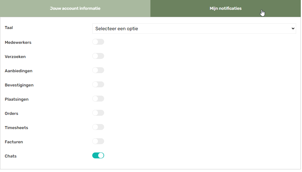 Het is handig om op te hoogte te worden gebracht van wijzigingen van verzoeken en aanbiedingen. Hiervoor kun je email notificaties instellen. Dit kun je doen in je account.